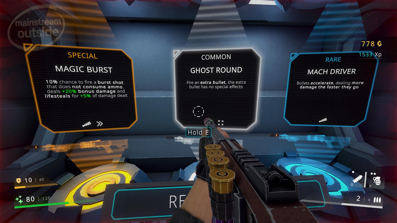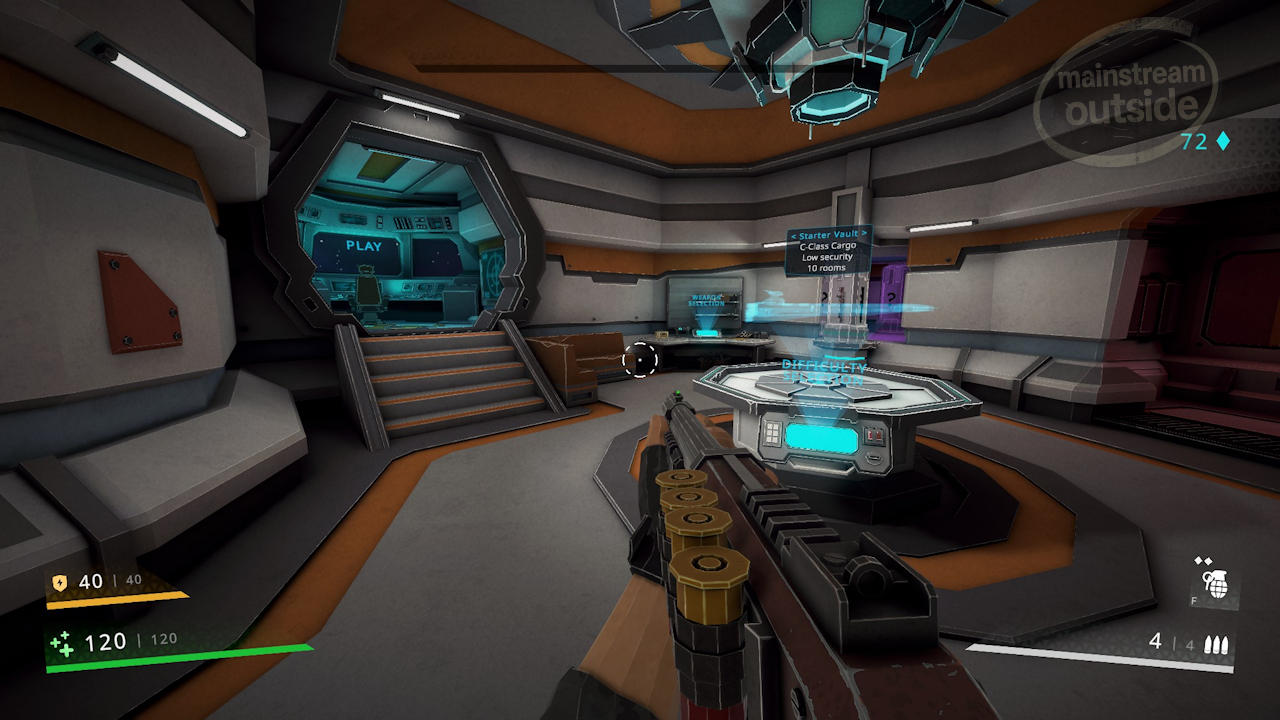 Weapon upgrades and weapon-based abilities are one of Galactic Vault’s standout features. After each firefight, you can access terminals, each offering a different improvement or ability. Don’t like what you see? Just feed 50 credits into the “upgrade machine,” and the terminals instantly roll three new upgrades. That doesn’t work for ability terminals, though.