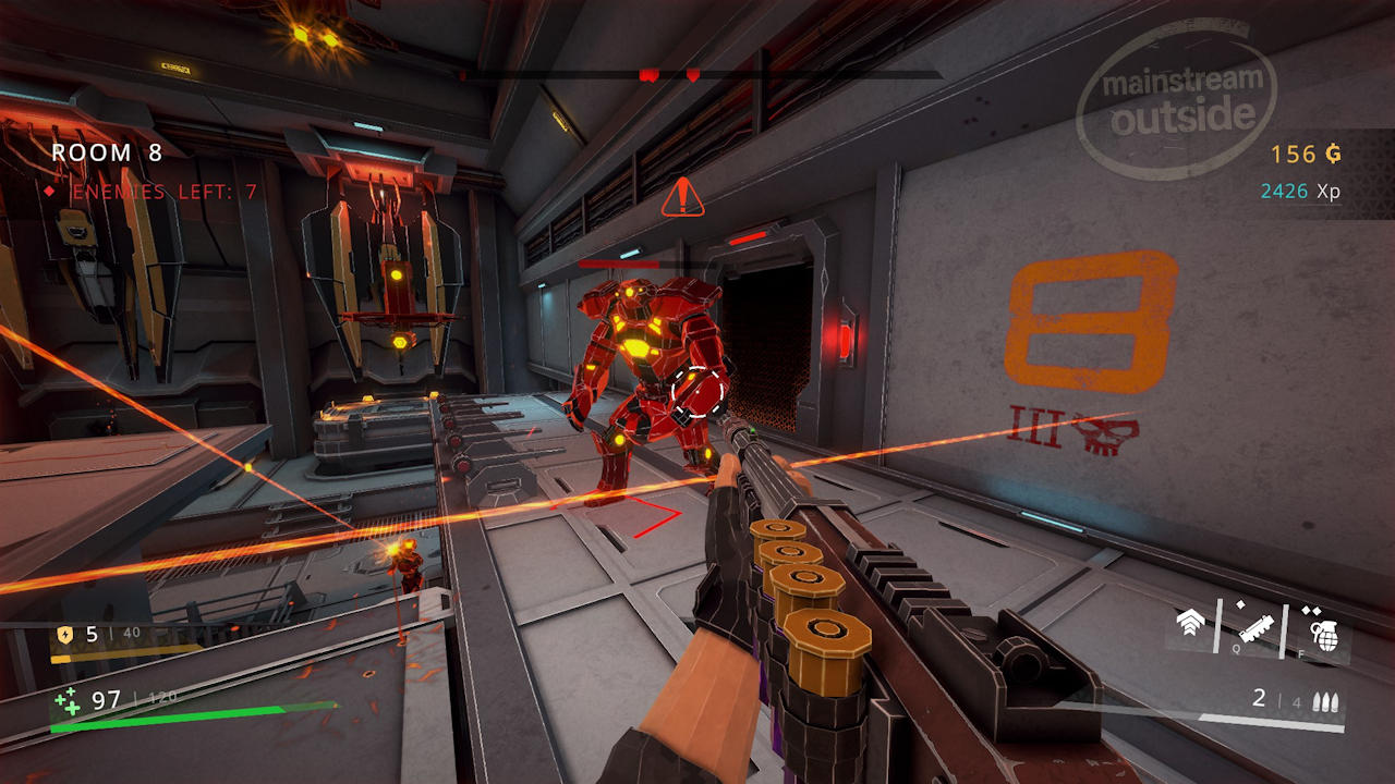It’s not quite as fast as Unreal Tournament or other high-speed shooters, but it still goes hard. Fewer than four machines attacking at once is rare; most of the time it’s more than that. On top of that, enemies love coming at you from every direction and level.