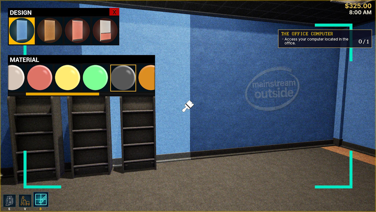 That starts with ordering the most basic furnishings, because aside from a service counter with a register and a few broken machines (for popcorn, soft drinks, cotton candy, and so on), the place is bare. So your first stop is the PC in the back room, where you order three shelves and three bundles of movies to get some early revenue going. Then again... hang on. The place still looks rough. Are there renovation tools, by any chance?