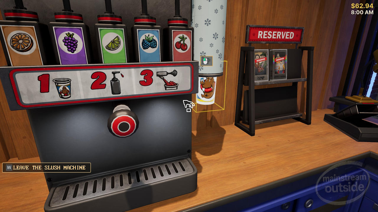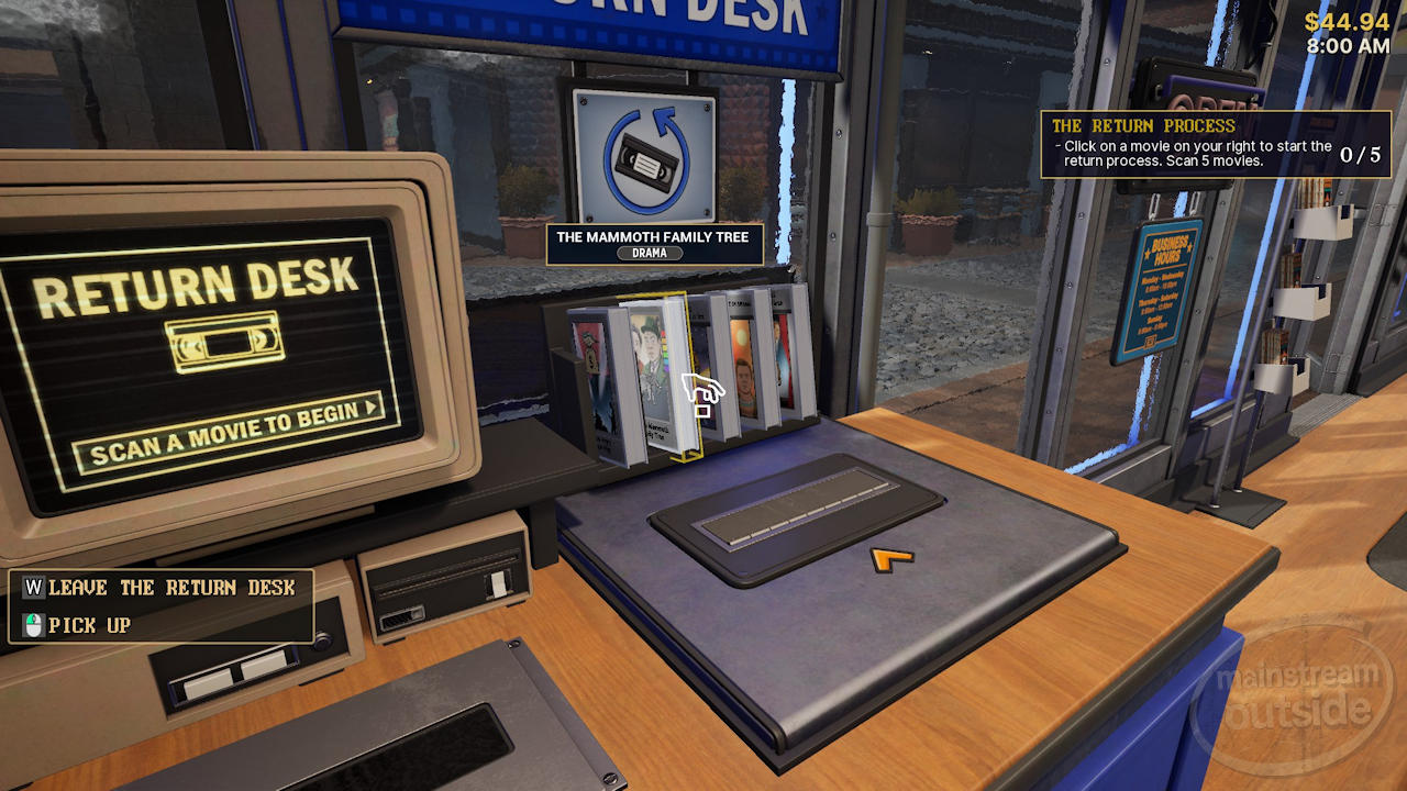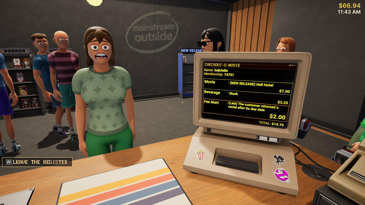 Most customers just rent movies, though, and the routine is always the same: take the tapes, run them over the scanner, grab the money out of the customer’s mitts, give change if needed—repeat. It can settle into a genuinely satisfying rhythm, partly because the register mechanics are technically very well done. Taking payment feels good, which applies to pretty much everything in the game.