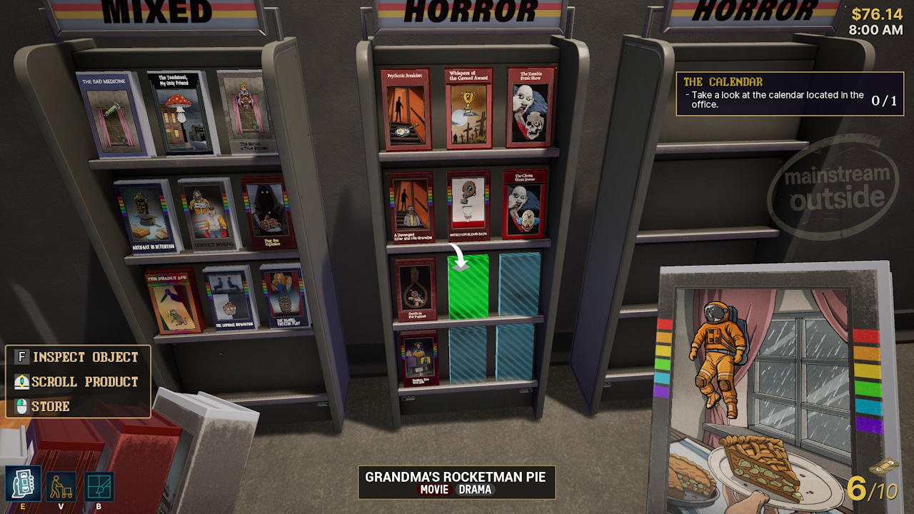Naturally, you spend most of the day serving customers. Some of them have special requests: one has a movie reserved, another is after something with a very specific vibe. Don’t know your catalog of fictional movies all that well yet? No prob, because shelves label themselves automatically based on what’s on them—if they only hold dramas, they’ll say "Drama"; if it’s a mixed bag, they’ll say "Mixed." On top of that, a tooltip tells you what each movie is about.