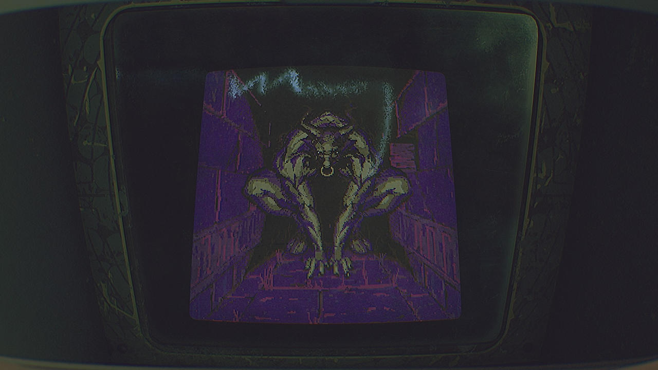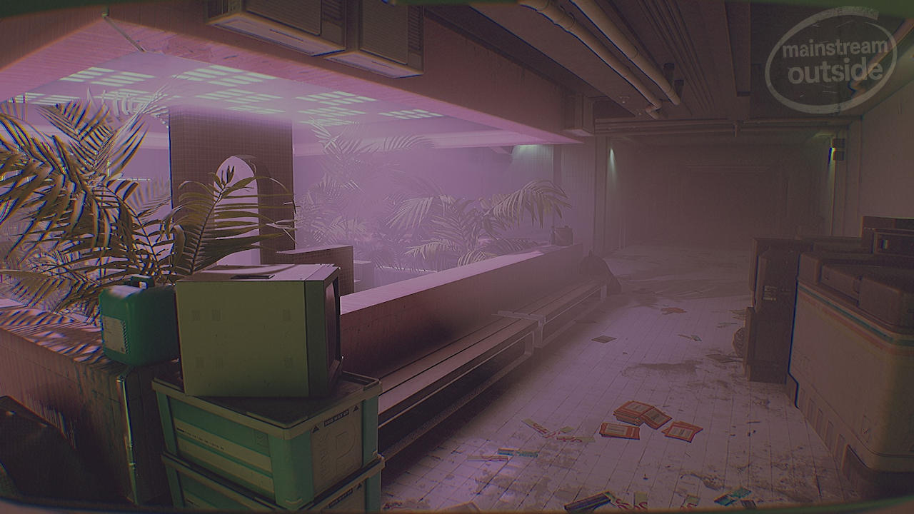 Most of the time, Routine takes place in interior areas connected by a shuttle train; only briefly does the homebody routine get interrupted by linear “moonwalks” outside. Those few outdoor sections mainly serve as contrast, an atmosphere boost, and a reminder of how isolated this place is. You’ll still find variety indoors too, especially in the “Megazone.” It’s a run-down “arcade oasis” where dusty cabinets flicker two functional minigames across their screens.