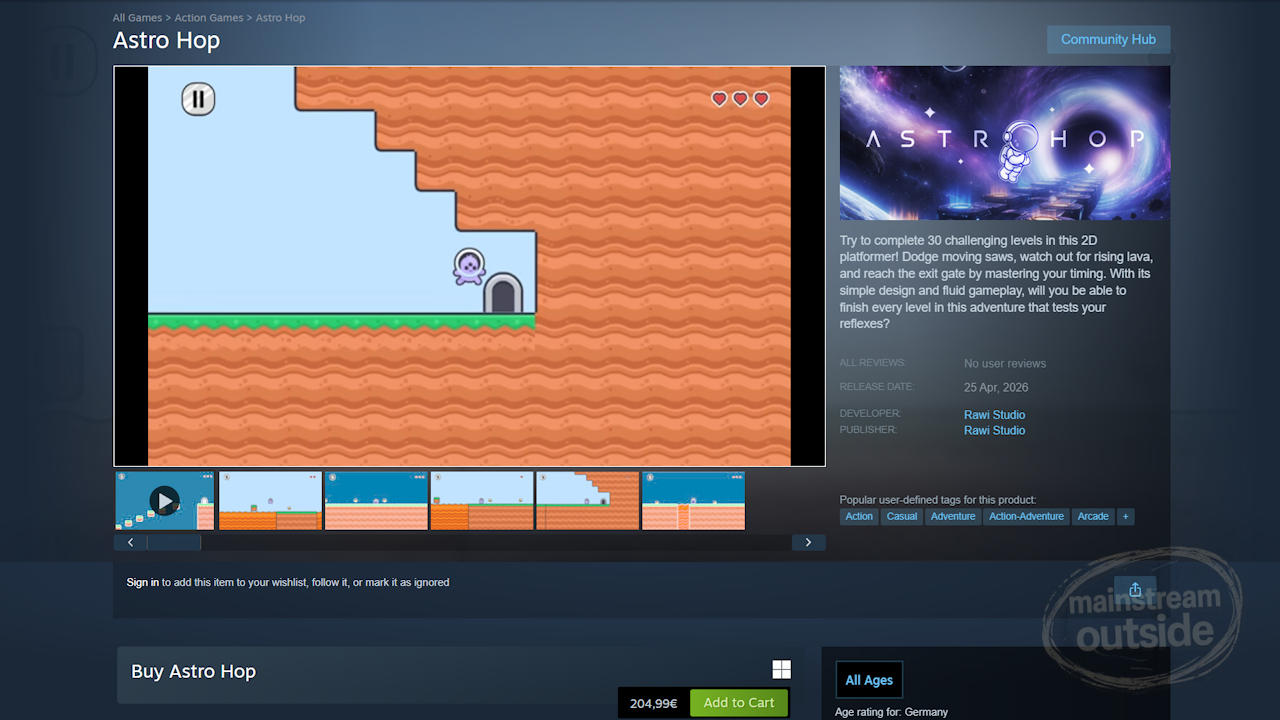 Is that the weird part about Astro Hop, then? Nope. The weird part is the price of this game, which does at least come with 30 levels: $200—or €204.99, as you can see in the screenshot. Well, maybe Astro Hop only runs on some special homebrew console that’s included in the price?